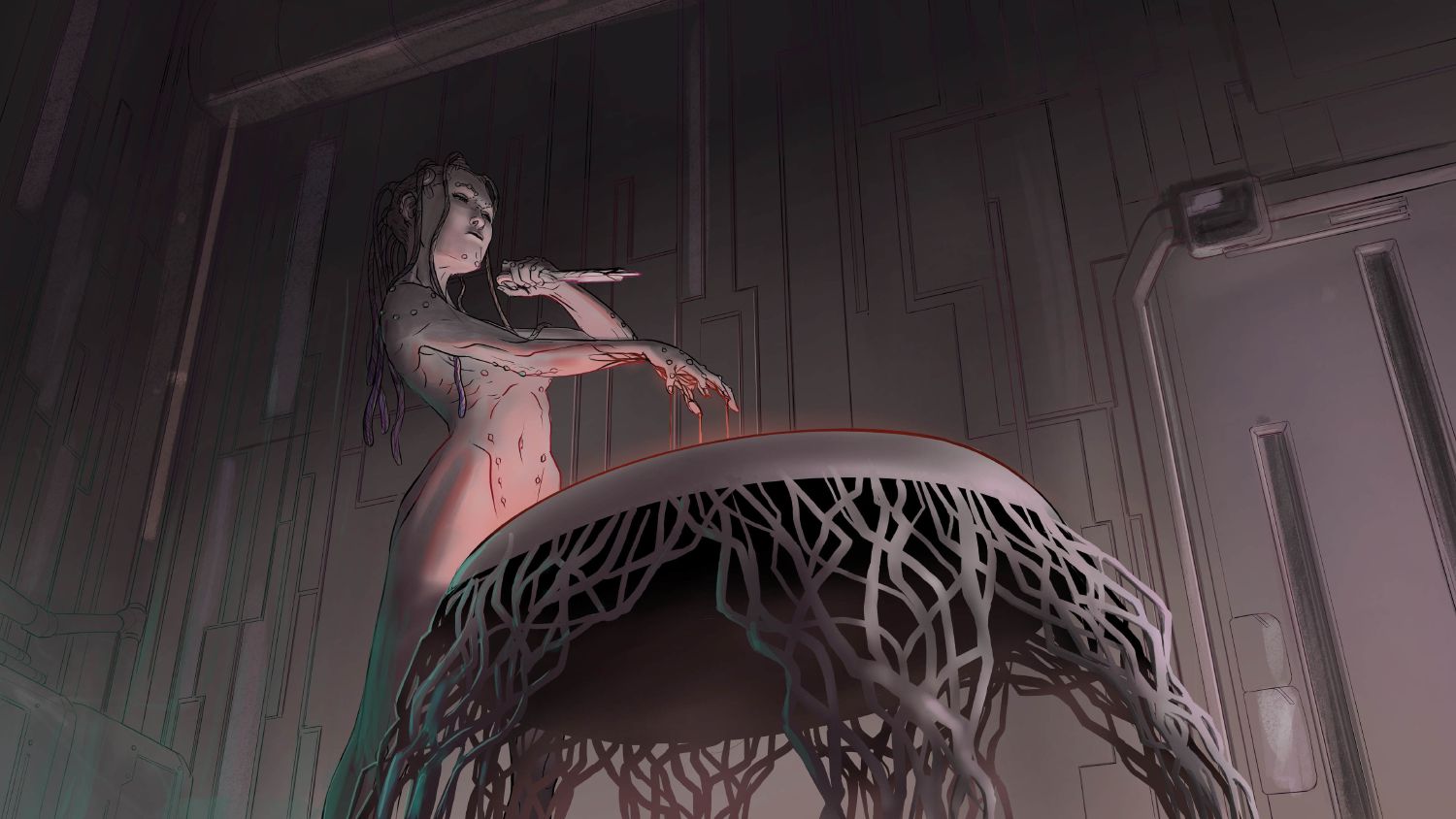 She leaned on both her hands against the table top. With her own blood she painted her lips and nipples. She picked up the knife. Her skin was still a bit damp after the shower. Staggering, she moved towards the door that opened on the other side of the preparation room. A transport pod that awaited her there took her to her starting position.