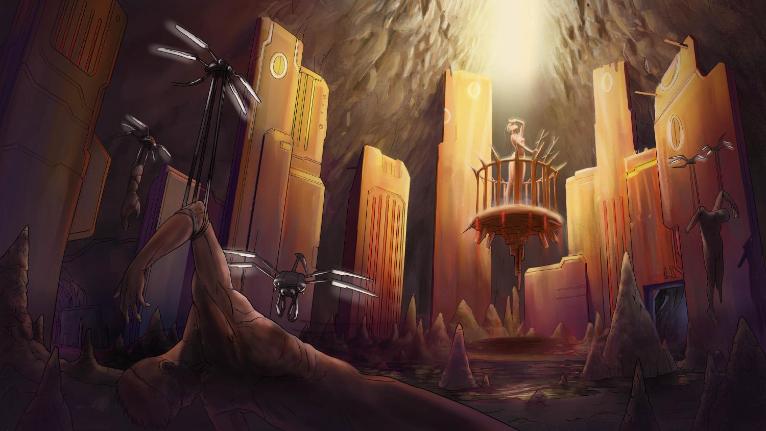 The pod entered a hall of a large lounge. The only piece of furniture here was a low bed with Mother Aina resting on it. Above her, fixed to the ceiling, the corpses of four men were hanging. The corpses were still dripping blood. On the bed and the Empress.