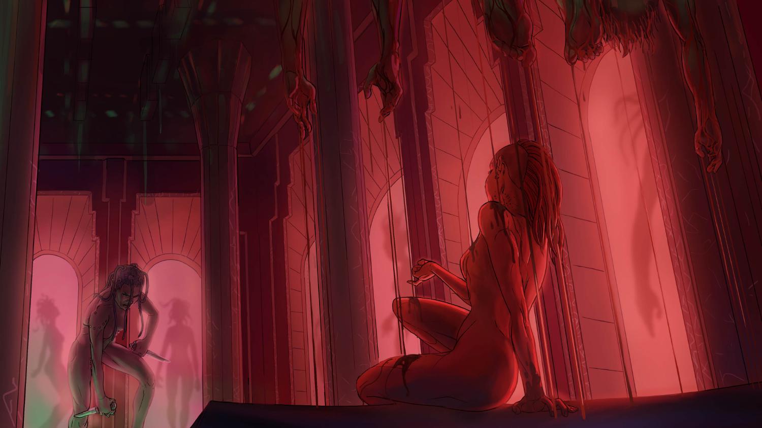 Gela threw the knives on the floor and approached Empress Aina. She stared pleasuring her with her blood stained fingers and her tongue. She could feel the drops of dense blood dripping from the ceiling. She watched the Empress climaxing from her touch and from every drop of blood that fell right into her mouth.