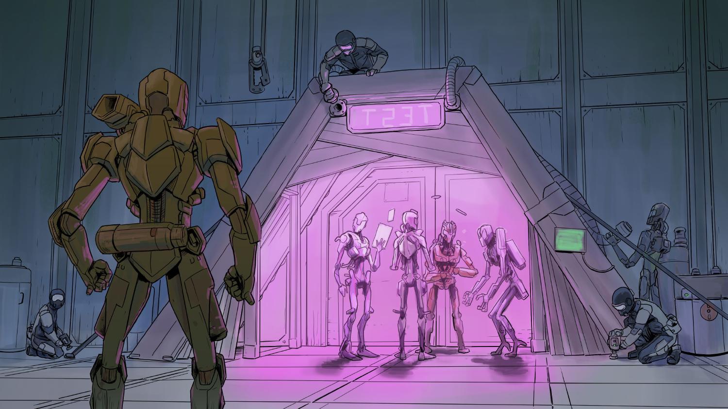 Then a truck approached from the city side. Sontro Nuezi, the right hand of the Empire’s Minister of Internal Affairs Aevy Van Skregge, got off and a few policemen without unit badges jumped out of its rear hatch. Sontro ran up to the crew setting up the decontamination around the entrance to the elevator. One of the AlterBots finished assembling a lock, pulled out from the rest and headed to meet him.