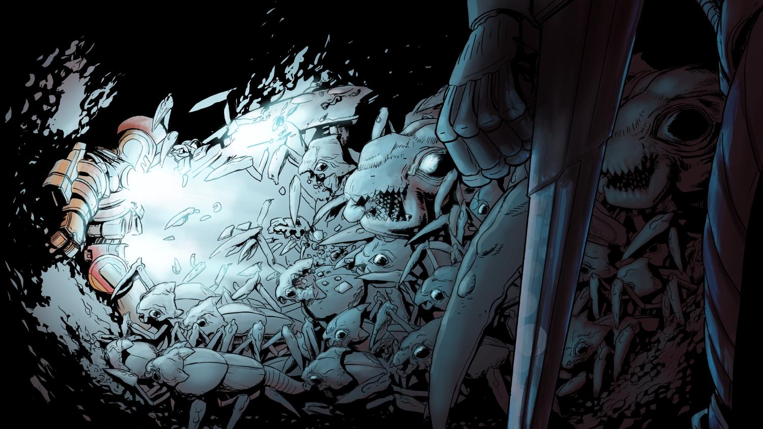 Three minutes down the butchery, Semper’s screen was flashing red reporting yet another actuator’s overload and combat analysis kept indicating another hundreds of insects approaching. Torrento lost one of his blades. It got stuck in one of the insect’s skull when another one jumped on it and crushed it into the same wall Semper was rammed into. Vibration mode broke in the other blade.