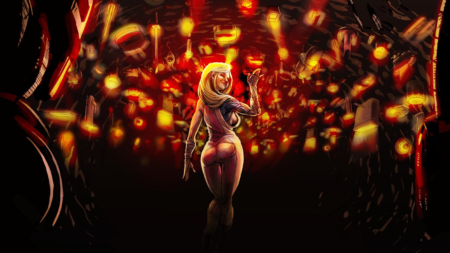 The girl got up to her feet. She spinned herself in place like some ballerina and traced a circle in the air with her cybernetic arm. The corridor behind her glistened with a thousand colorful lights and came to life.