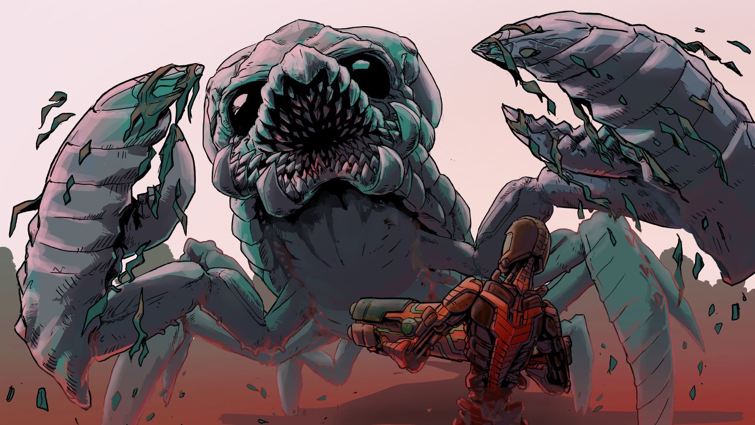 Are you familiar with the nasty insects from Barbetus? That thing that was gliding towards me looked like them but was ten times bigger. The monster’s maw rotated 180 degrees. I think it only noticed me when I moved. I automatically lifted my hands.