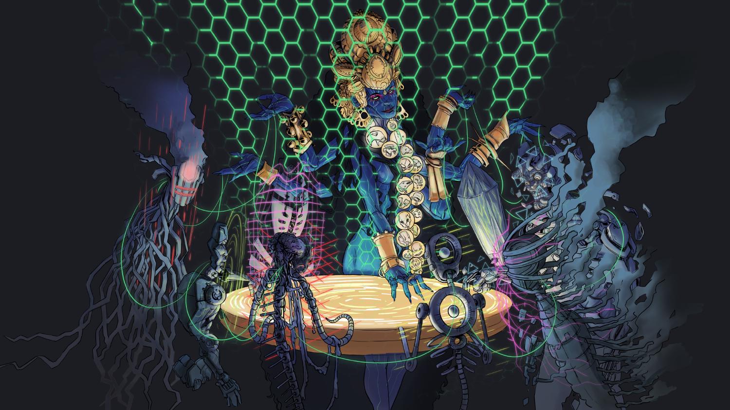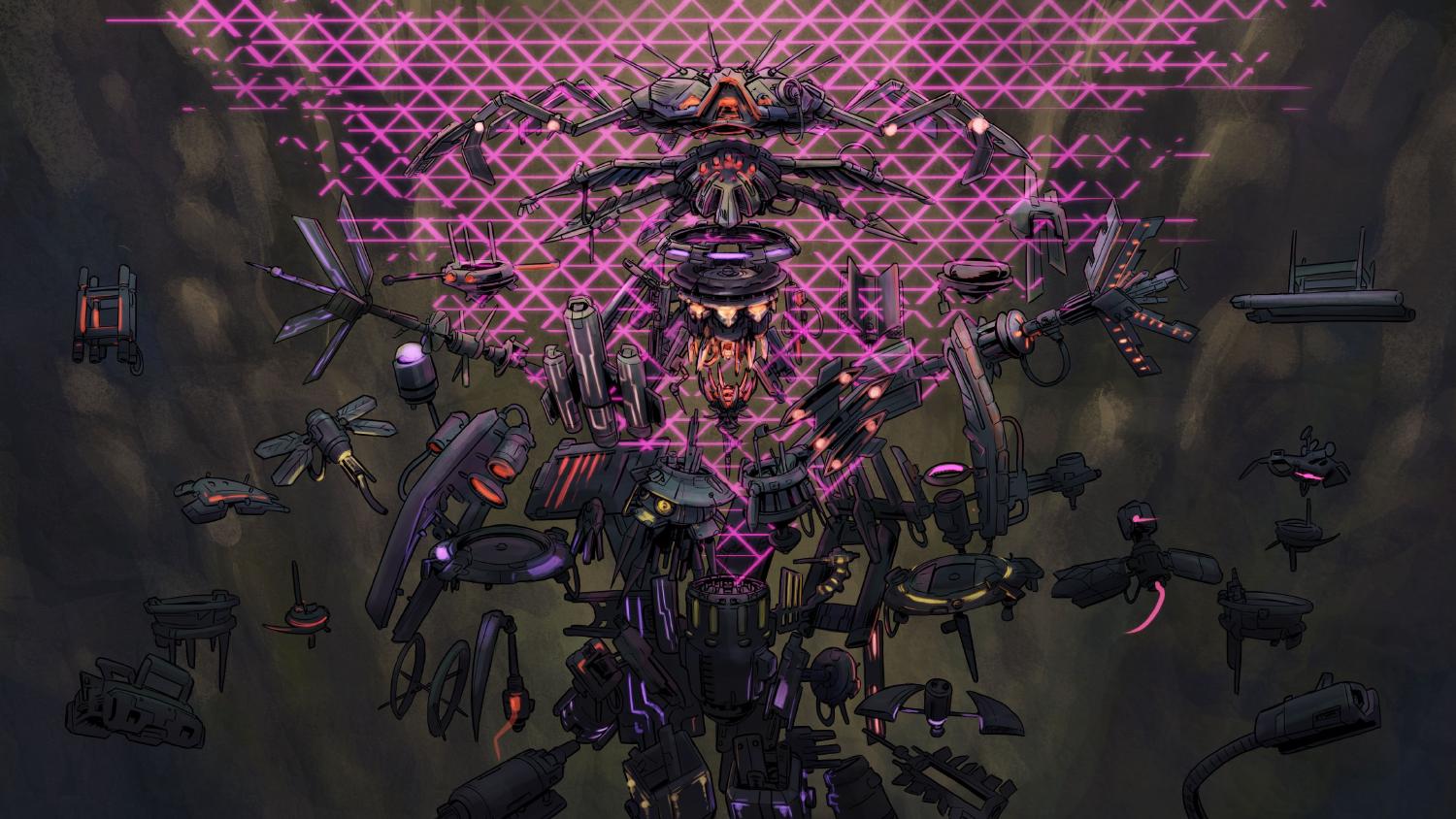 So in spite of the fact that she kept a sort of a central unit she called the Black Queen, the majority of her mind consisted of a collective of several thousand drones, from simple conservation mechanisms to highly specialized construction and medical robots. Choosing this solution, she had to accept that from then on her decisions wouldn’t be just plain commands issued to the other machines and that these machines would participate in the decision-making process. Eleven created a real cybernetic swarm. The basic assumptions of her swarm were to protect the Black Queen and to ensure that in case she gets destroyed, a small group of worker drones was capable of reconstructing her in another place. Eleven firmly refused to join the “1000”. Therefore, the “1000” joined forces and destroyed her original nest which was still located in the biological lab.